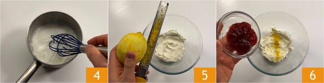 Mélangez soigneusement pour la dissoudre à l'aide d'un fouet 4. Dans un bol, versez le mascarpone avec le zeste de citron râpé 5 et la confiture de fraises 6.