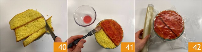Enlevez l'excédent en coupant le bord du bol avec un couteau 40 et imbibez avec plus d'alchermes la surface 41. Couvrez avec du film alimentaire 42 et laissez reposer au réfrigérateur quelques heures.