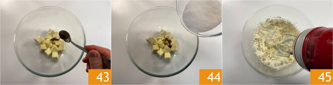 En attendant, préparez la tarte douce qui sera la base de votre gâteau : dans un bol, versez le beurre et l'extrait de vanille 43. Ajoutez le sucre 44 et battez le mélange avec un fouet électrique 45.