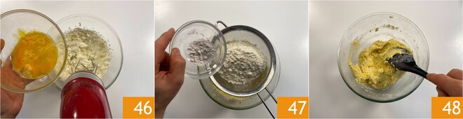Incorporez les œufs, un à la fois 46, et enfin tamisez la farine et la levure 47, ajoutez aussi le sel et mélangez bien 48.