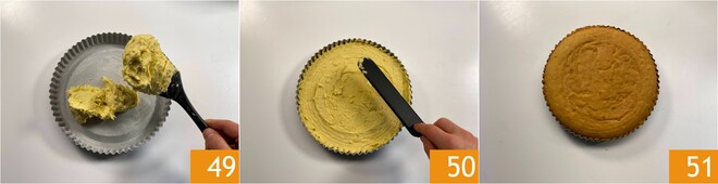 Versez le mélange dans un moule malin de 22 cm de diamètre, beurré et fariné 49, nivelez bien la surface avec la spatule 50 et faites cuire au four statique préchauffé à 180° pendant environ 25 minutes. Sortez la tarte douce du four et laissez-la refroidir 51.
