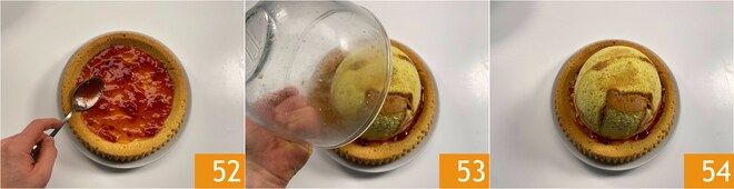 Une fois froide, démoulez la tarte douce sur un plat de service, garnissez le creux avec la confiture de fraises 52, puis au centre, retournez le zuccotto 53, qui se sera bien raffermi au réfrigérateur 54.