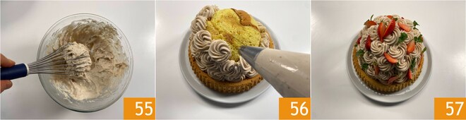 Reprenez la crème réalisée au début pour la décoration : battez-la un peu avec le fouet pour l'assouplir 55, puis transférez-la dans une poche à douille avec une douille en forme de fleur de 1,2 cm de diamètre. Décorez toute la surface du dôme avec des roses de crème 56, enfin garnissez avec des morceaux de fraises et des petites feuilles de menthe. Le gâteau bouquet de fraises est prêt pour la fête 57 !