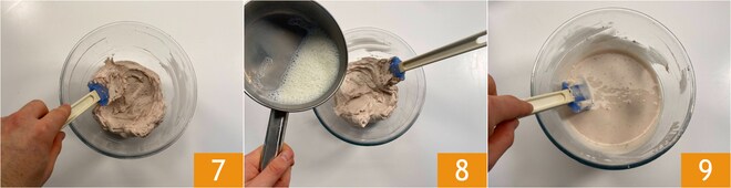 Mélangez avec la maryse 7, puis incorporez le lait où vous avez dissous la gélatine 8 et mélangez à nouveau pour bien l'incorporer 9.