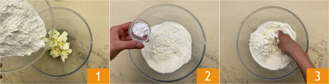 Pour préparer la sbriciolata à la confiture, versez dans un bol le beurre froid en cubes, la farine 1 et la levure 2, commencez à émietter le mélange avec les mains 3.
