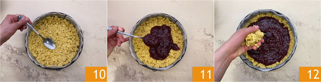Tassez le fond avec les mains ou le dos d'une cuillère 10 et formez aussi le bord. Répartissez la confiture 11 et recouvrez avec les miettes restantes 12.