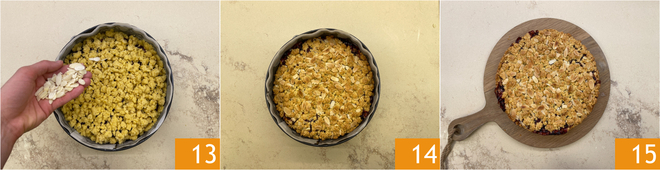 Vous devez couvrir toute la surface, alors répartissez les amandes effilées 13. Faites cuire au four statique préchauffé à 180° pendant environ 60 minutes.