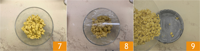 Continuez à émietter le mélange pour former de grosses miettes 7, couvrez de pellicule plastique et placez au réfrigérateur pendant 1 heure 8. Tapissez de papier sulfurisé un moule à charnière de 22 cm de diamètre, versez 2/3 de la pâte 9.