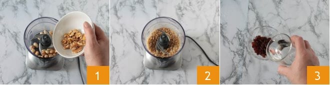 Pour préparer le gâteau d'hiver, commencez par mettre dans le bol d'un mixeur noix, amandes et noisettes 1. Mixez le tout grossièrement 2, sans obtenir une consistance trop fine. Placez les raisins secs dans un petit bol et ajoutez de l'eau tiède jusqu'à les couvrir 3. Laissez-les tremper et en attendant, préparez la pâte.
