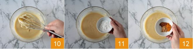 Amalgamez le tout jusqu'à obtenir une pâte homogène 10. Ajoutez la levure 11 et les épices (curcuma, cannelle et gingembre) 12. Mélangez encore.