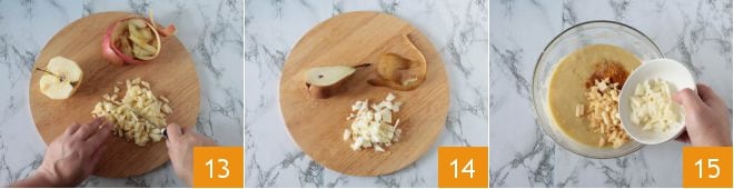 Épluchez la pomme et coupez-la en petits morceaux 13. Faites de même avec la poire 14 et transférez-les toutes deux dans la pâte 15.