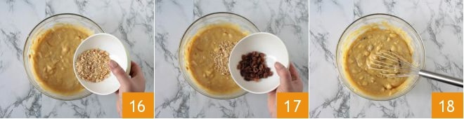 Ajoutez 30 g de fruits secs hachés 16. Égouttez et pressez légèrement les raisins secs, prenez-en 1/3 et ajoutez-les à la pâte 17. Mélangez le tout une fois de plus.