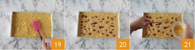 Transférez dans un moule rectangulaire de 30x19 cm, recouvert de papier sulfurisé et nivelez la surface avec une spatule. Saupoudrez le gâteau avec 30 g de fruits secs supplémentaires et la moitié des raisins secs restants 20. Versez le miel en filet par-dessus, en essayant de l'étaler partout 21.