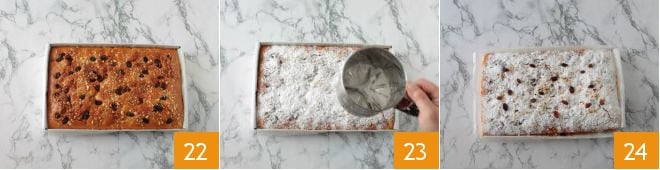 Faites cuire dans un four statique préchauffé à 180°C pendant environ 35 minutes, puis couvrez le gâteau avec une feuille d'aluminium pendant 10 minutes supplémentaires. Sortez le gâteau d'hiver du four 22 et laissez-le refroidir complètement. Une fois bien froid, saupoudrez-le de sucre glace 23 et garnissez-le avec les fruits secs hachés et les raisins secs restants 24.