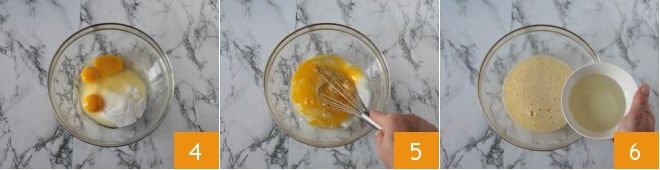Dans un bol, mélangez les œufs et le sucre 4 ; travaillez-les avec un fouet à main jusqu'à obtenir une consistance mousseuse. Ajoutez ensuite l'huile de graines 6