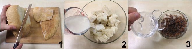 Pour préparer le gâteau de pain, enlevez la croûte du pain 1: vous devrez obtenir 300 g de mie de pain que vous couperez en morceaux et mettrez dans un bol à tremper dans le lait pendant environ 10 minutes 2. Faites également tremper les raisins secs dans de l'eau pendant cinq minutes pour les raviver 3.