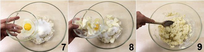 Après les dix minutes écoulées, pressez bien la mie et ajoutez-y le sucre et l'œuf 8, puis le beurre ramolli coupé en morceaux 8. Mélangez bien avec une cuillère en bois pour bien amalgamer tous les ingrédients 9.