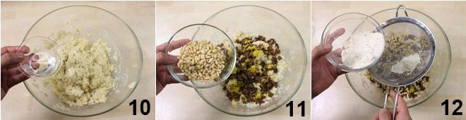 Ajoutez la grappa 10, puis les raisins secs égouttés, le zeste de citron, les pignons de pin 11 et enfin la farine tamisée 12.