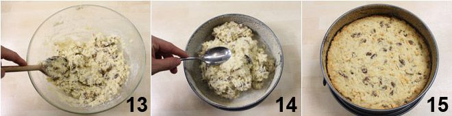 Mélangez très bien les ingrédients jusqu'à obtenir un mélange compact et homogène 13 que vous transférerez dans le moule beurré 14. Avec le dos d'une cuillère, étalez-le uniformément et aplatissez la surface 14, enfournez le gâteau à 180° degrés pendant environ 60 minutes : la surface doit être dorée 15. Sortez du four et laissez refroidir : votre gâteau de pain est prêt!