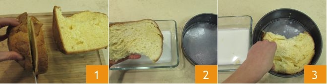 Pour préparer le gâteau de panettone gastronomique, coupez le panettone salé en tranches d'environ 3 centimètres 1, obtenant ainsi 6 tranches. Beurrez un moule à charnière de 20 cm, trempez une première tranche de panettone dans le lait 2 et disposez-la au fond du moule en appliquant une légère pression 3.