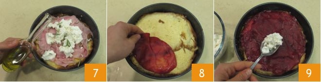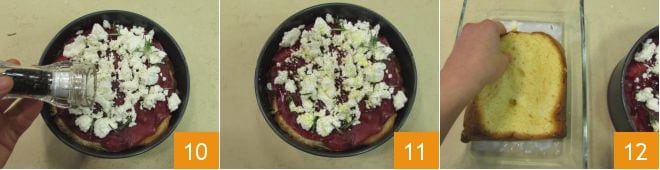 quelques aiguilles de romarin et de l'huile 7, ajustez le poivre et recouvrez cette couche avec deux autres tranches de panettone trempées, en veillant toujours à les disposer uniformément. Disposez alors, en créant la deuxième couche, la bresaola 8, ajoutez le chèvre (le fromage de chèvre français) 9,