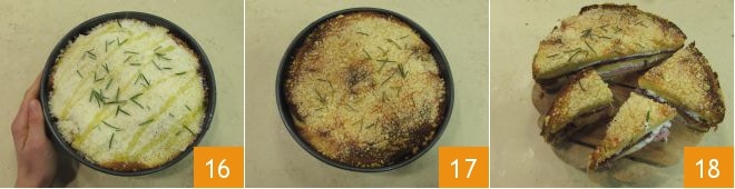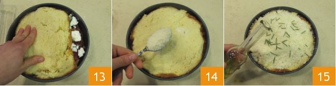 et disposez-les à l'intérieur du moule 13, saupoudrez la surface de Parmesan 14, de romarin, d'un filet d'huile 15, de poivre.