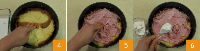 Trempez et disposez également une deuxième tranche en exerçant une légère pression pour recouvrir entièrement le fond 4. Répartissez les tranches de jambon cuit 5, la ricotta 6,