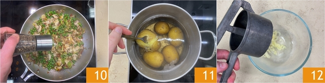 Ajustez en sel et poivre 10 ; ajoutez la marjolaine et éteignez le feu. À ce stade, les pommes de terre devraient être cuites. Vérifiez-les en les piquant avec une fourchette 11. Égouttez-les, laissez-les tiédir légèrement, puis écrasez-les encore chaudes à l'aide d'un presse-purée 12, en recueillant la purée dans un bol.