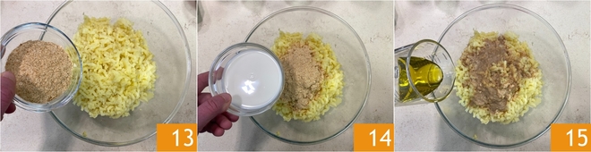Ajoutez à la purée de pommes de terre la levure alimentaire 13, la boisson végétale à l'avoine 14 et l'huile d'olive extra vierge 15