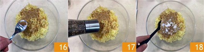 Ajoutez aussi la noix de muscade 16, le sel et le poivre 17. Mélangez bien avec une spatule 18.
