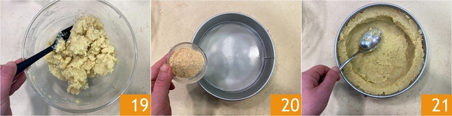 Vous devez obtenir une préparation crémeuse et homogène 20. Huilez un moule rond de 22 cm et saupoudrez le fond de chapelure 20. Versez la moitié des pommes de terre à l'intérieur et aplatissez-les avec le dos d'une cuillère de façon à obtenir une épaisseur plus importante sur les bords 21, créant ainsi un creux pour la garniture.