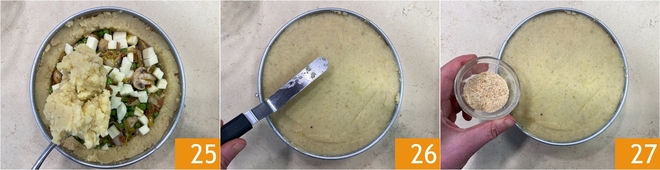 Couvrez avec le reste de la préparation de pommes de terre 25, lissez délicatement la surface 26, terminez en saupoudrant de chapelure 27.