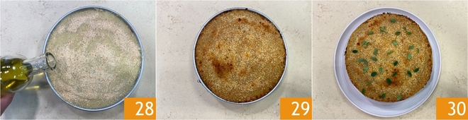 Ajoutez un filet d'huile d'olive extra vierge. Faites cuire dans un four statique préchauffé à 180 °C pendant 35–40 minutes, jusqu'à ce que la surface soit bien dorée. Une fois cuit, laissez reposer le gâteau 10–15 minutes avant de le découper : cette étape est essentielle pour obtenir des tranches bien compactes. Le gâteau végane est prêt à être servi 30.