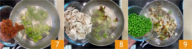 Ajoutez les tomates séchées 7 et les champignons tranchés 8. Ajoutez enfin les pois blanchis 9 et laissez cuire pendant 5–10 minutes.