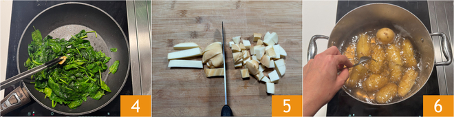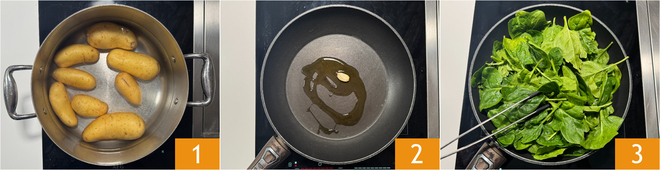 Pour préparer le gâteau de pommes de terre végétarien, commencez par faire cuire les pommes de terre en les plongeant dans de l'eau froide, puis comptez environ 40 minutes à partir de l'ébullition 1. Pendant ce temps, préparez les épinards : chauffez un filet d'huile dans une poêle avec l'ail 1, puis ajoutez les épinards 3 et une pincée de sel.