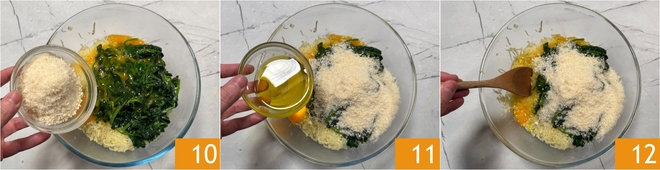 Ajoutez également le fromage râpé 10 et l'huile 11, puis mélangez le tout 12.