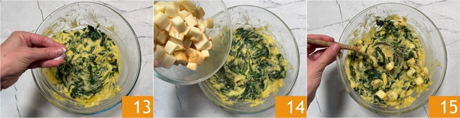 Rectifiez l'assaisonnement en sel 13 et en poivre. Enfin, incorporez les dés de scamorza 14 et mélangez bien pour obtenir une préparation homogène 15.