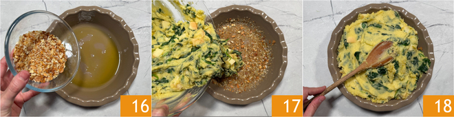 Prenez un moule évasé d'un diamètre de 20 cm à la base et 26 cm en surface, huilez le fond et saupoudrez-le de la moitié de la chapelure 16. Versez le mélange de pommes de terre à l'intérieur 17 et égalisez 18.
