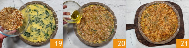 Recouvrez la surface avec le reste de chapelure 19 et arrosez d'un filet d'huile 20. Faites cuire dans un four statique préchauffé à 200° pendant environ 40 minutes, ou jusqu'à ce qu'une belle croûte dorée se forme. Si nécessaire, activez le grill pour encore une ou deux minutes. Sortez le gâteau de pommes de terre végétarien du four et laissez-le reposer quelques minutes avant de le servir 21 !
