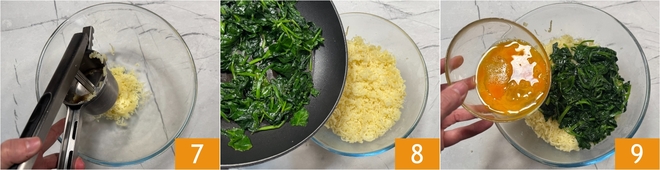 Égouttez les pommes de terre et écrasez-les dans un saladier (la peau restera dans le presse-purée) 7. Ajoutez les épinards 8 et les œufs battus 9.