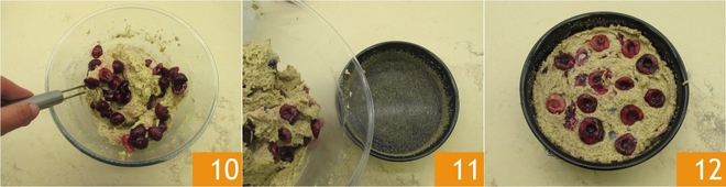 Maintenant, avec la spatule, ajoutez les cerises et mélangez avec des mouvements circulaires 11. Beurrez et sucrez un moule à charnière de 18 cm. Versez la pâte dans le moule 11, en la répartissant de manière assez uniforme avec une spatule ou le dos d'une cuillère 12.