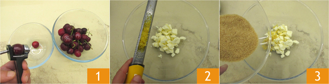 Pour préparer le gâteau de sarrasin aux abricots et cerises, dénoyautez 1 et coupez les cerises en deux. Dans un bol, versez le beurre pommade avec le zeste de citron 2, une pincée de sel et 150 g de sucre de canne 3.