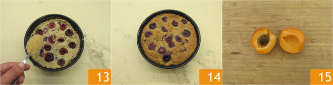 Saupoudrez légèrement la surface avec juste assez de sucre de canne 13. Faites cuire dans un four statique préchauffé à 160° pendant environ 55-60 minutes, faites le test du cure-dent au cœur pour vérifier la cuisson 14. Coupez les abricots en deux, retirez le noyau 15.