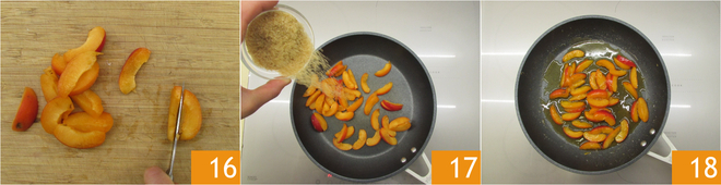 Ensuite, réduisez-les en quartiers 16. Faites-les revenir dans une poêle avec 50 g de sucre de canne à feu vif 17 : dès qu'ils sont uniformément enrobés de caramel, retirez du feu 18, avant qu'ils ne commencent à trop s'imbiber et à perdre en consistance. Cela prendra 2-3 minutes.