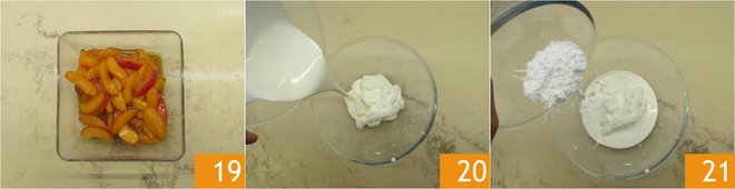 Réservez les abricots au sirop 19. Dans un bol, versez la crème, le yaourt grec 20 et le sucre glace 21.