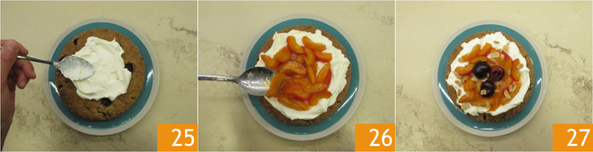 Une fois le gâteau prêt, laissez-le refroidir complètement avant de le démouler et de le recouvrir avec la crème de yaourt 25 et les abricots caramélisés 26. Complétez avec quelques cerises et des éclats d'amandes grillées. Le gâteau de sarrasin avec cerises et abricots est prêt à être servi 27.