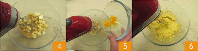 Battez avec les fouets 4. Une fois que le mélange devient crémeux, ajoutez les œufs un par un 5 et fouettez pendant 3-4 minutes après l'ajout complet 6.