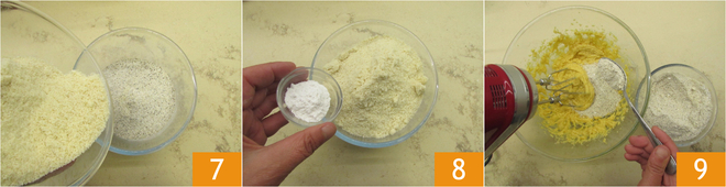 Dans un bol, mélangez la farine de sarrasin, la farine d'amandes 7 et la levure tamisée 8, incorporez bien les poudres avec le fouet, une cuillère à la fois 9.