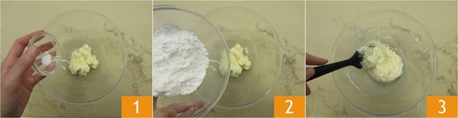 Pour préparer le gâteau des roses, commencez par préparer la crème au beurre et l'émulsion de beurre 24 heures à l'avance. Pour la crème au beurre : mettez le beurre pommade, le sel 1 et le sucre glace 2 dans un bol. Mélangez avec une spatule jusqu'à obtenir une crème lisse 3.