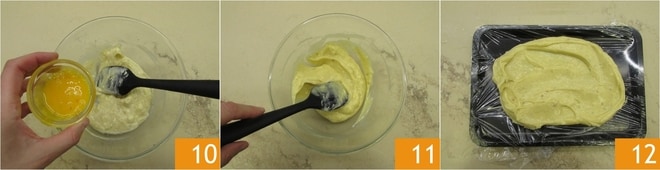 Ajoutez les jaunes d'œufs en filet 10, en mélangeant jusqu'à ce qu'ils soient bien incorporés 11. Vous devez obtenir une émulsion pas trop montée. Transférez-la maintenant sur un plateau recouvert de film plastique 12 et conservez au réfrigérateur pendant environ 12 heures jusqu'à l'utilisation : elle doit avoir une température de 10 degrés pour être utilisée dans la recette.